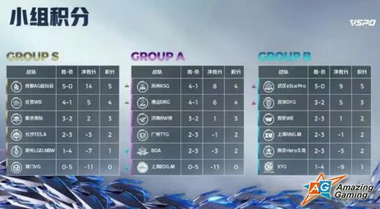 WB只输给了AG一场,他们凭借5个大场积分紧随其后。接下来是狼队,他们输给了AG和WB,拿到了3分。最后一个晋级季后赛的名额被TES.A拿走,他们2胜3负成绩,净胜分为-3分,只能说S组“阶梯”还是很分明的,从第一名到第五名积分从5到1,非常有意思。